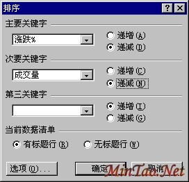 如果想让涨跌相同的股票按照成交量的大小来排列,打开“数据”菜单,单击“排序”命令,打开“排序”对话框;可以看到Excel自动选定了一个排序区域,我们看它的选取还是正确的;在“排序”对话框中我们可以设置三个排序的条件,我们这里只要用两个就可以了,现在工作表排序的主要关键字是“涨跌%”,按递增排列,将其改为“递减”,设置一下次要关键字:单击“次要关键字”一栏中下拉列表框的下拉箭头,从列表中选择“成交量”,后面也选择为递减;注意下面的标题行的设置,这里选择的是“有标题行”,对于不想对标题行也一起排序时一定要选这个选项;然后单击“确定”按钮。(如下左图)
