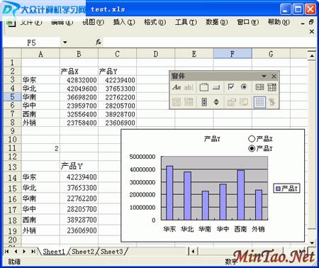 假设有一家公司要统计两种产品(产品X,产品Y)的销售情况,这两种产品的销售区域相同,不同的只是它们的销售量。按照常规的思路,我们可以为两种产品分别设计一个图表,但更专业的办法是只用一个图表,由用户选择要显示哪一批数据——即,通过单元按钮来选择图表要显示的数据。