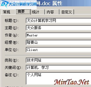 切换选项卡到“摘要”,按上图输入信息即可!