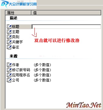 在窗口中,有属性列和值列,对应于属性列的名称,只要双击值列,就可显示输入框,如上图,如果要删除相关的摘要信息,清除内容即可,如果要添加,那么就在输入框中输入内容即可!以上即为批量删除与添加操作过程!