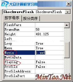 另外,如果想让FLASH不自动播放,我们还可以将“Playing”属性设置为False;这种情况针对插入的FLASH动画自带播放、暂停和停止等功能,否则问题就更加麻烦;