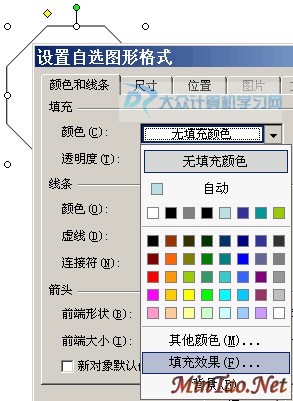 上图中,我们切换到“颜色和线条”选项卡,之后在“颜色”右边的下拉组合框中进行点击,在列表里面点击“填充效果”;弹出如下图的对话框!