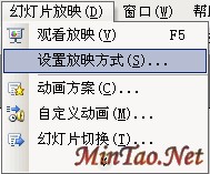 首先在PowerPoint窗口中执行操作“幻灯片放映”→“设置放映方式…”如下图: