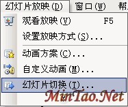 执行操作“幻灯片放映”→“幻灯片切换…”如下图: