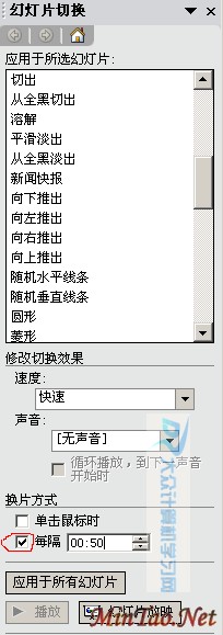 此外,如果您还想设置幻灯片切换的效果、速度、声音等,请在上图中的上半部分自行设置!