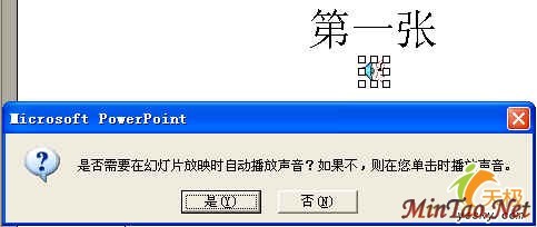 1、把全部幻灯片做好,在需要插入声音的幻灯片中,单击“插入”菜单下的“影片和声音” →“文件中的声音”,选择所需的声音文件,在出现“是否需要在幻灯片放映时自动播放声音?”的对话框时选择“是”(如图1)。