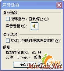 如果是在Office PowerPoint 2003中操作,第2步的画面如图4,这里有一个“显示选项”可供选择,我们可以勾选“幻灯片放映时隐藏声音图标”项,这样在播放幻灯片过程中就不会显示声音图标了。