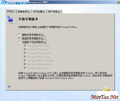 另外,还有一部分人只是想安装office2007来玩玩,工作中还是用office2003。这也没关系,微软对office安装的改进可以让office2007和office2003并存在一个系统中。运行office2007的安装,选择“自定义”安装,安装程序会自动扫描到系统中已经安装的office程序,并提示3种升级安装方式,选择“保留所有早期版本”,(图2)
