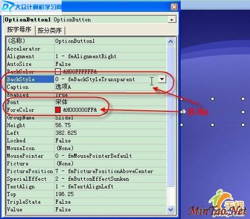 单击“BackStyle”项目,然后在右侧的下拉列表中选择“0-fmBackStyleTransparent”,可以使做出的单选项背景透明。点击“Font”输入框,然后单击出现的按钮,可以设置字体、字号等格式。点击“Forecolor”输入框,则可以设置颜色。如图2所示。
