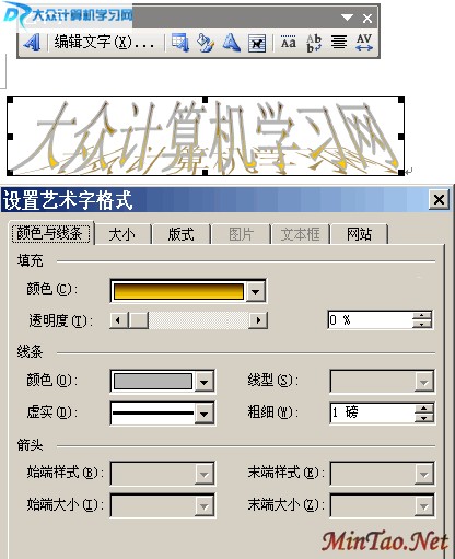 如上图,选择一种艺术字的样式,之后点“确定”,进入下一个对话框,在这里输入自己想要的艺术字文字即可,再点“确定”以确认插入的艺术字! ②:对于已插入的艺术字,可以进行与之相关的很多操作! 比如:修改艺术字的文字:在艺术字上面点右键,弹出快捷菜单,选择“艺术字文字”,即可编辑修改; 设置艺术字的版式:在艺术字上面点右键,弹出快捷菜单,选择“设置艺术字格式”,即可编辑修改;如下图!在这里,除了版式可修改之外,我们还能设置颜色与线条,大小等一系列的操作!