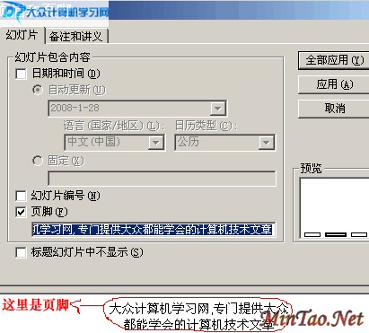 在PowerPoint添加页脚,按上述方法,反过来操作即可!如果要添加页眉,那么请切换到“备注和讲义”选项卡,在里面可以设置! [C语言系列]C# 文件创建、移动、删除、复制 [C语言系列]C#注册表的读,写,删除,查找 [Web开发]asp函数:创建数据表/创建列/添加字段/修改字段/A… [Web开发]ASP添加、删除、修改、数据表SQL语句 [搜索优化]闵涛——如何让百度重新收录你的网站,网站被K怎么… [电脑应用]教你如何远程管理MSSQL数据库 [Web开发]教你如何在PHP开启gzip页面压缩实例介绍 [办公软件]在Powerpoint中如何插入Flash动画 [办公软件]如何在Powerpoint 中(实现)输入上标、下标 [办公软件]如何实现Office工具栏、菜单以及菜单命令重命名