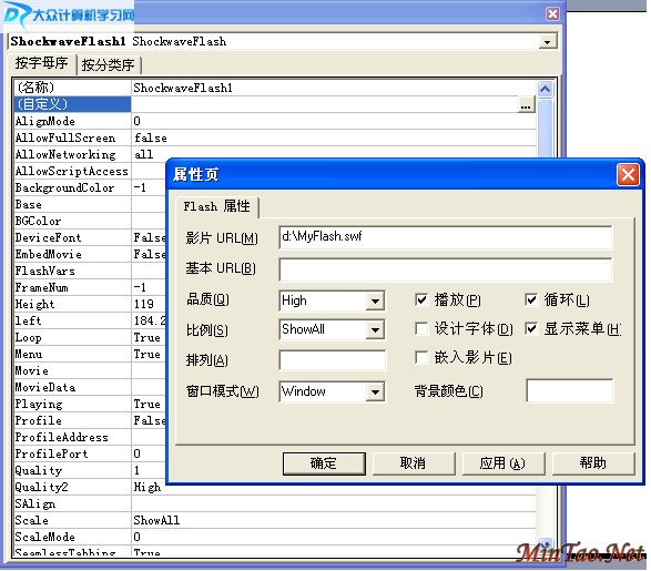 点击(自定义)属性最右边的带有“…”的按钮,在弹出的“属性页”对话框中的影片URL(M)中填写Flash的地址,如上图,这里填写本地路径(也可以填写来自网络的地址),相关的属性可以自己设置,好了按确定就行;