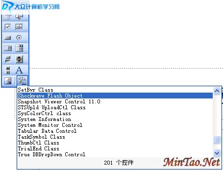 点击右下的工具,并在里面选择”Shockwave Flash Object”选项,之后,鼠标指针变为十字型,这个时候,在幻灯片里面直接按鼠标左键拖出一定长宽的Flash控件框;