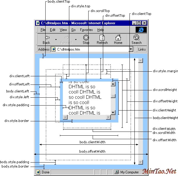 scrollHeight: 获取对象的滚动高度。 scrollLeft:设置或获取位于对象左边界和窗口中目前可见内容的最左端之间的距离 scrollTop:设置或获取位于对象最顶端和窗口中可见内容的最顶端之间的距离 scrollWidth:获取对象的滚动宽度 offsetHeight:获取对象相对于版面或由父坐标 offsetParent 属性指定的父坐标的高度 offsetLeft:获取对象相对于版面或由 offsetParent 属性指定的父坐标的计算左侧位置 offsetTop:获取对象相对于版面或由 offsetTop 属性指定的父坐标的计算顶端位置 event.clientX 相对文档的水平座标 event.clientY 相对文档的垂直座标 event.offsetX 相对容器的水平坐标 event.offsetY 相对容器的垂直坐标 document.documentElement.scrollTop 垂直方向滚动的值 event.clientX+document.documentElement.scrollTop 相对文档的水平座标+垂直方向滚动的量 以上主要指IE之中,FireFox差异如下: IE6.0、FF1.06+: clientWidth = width + padding clientHeight = height + padding offsetWidth = width + padding + border offsetHeight = height + padding + border IE5.0/5.5: clientWidth = width - border clientHeight = height - border offsetWidth = width offsetHeight = height (需要提一下:CSS中的margin属性,与clientWidth、offsetWidth、clientHeight、offsetHeight均无关)