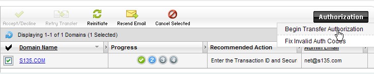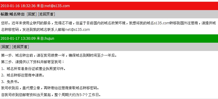 我的 s135.com 域名是在“新网”的代理商“上海企联网”注册的,于是在2010年1月16日向代理商索要域名转移密码。代理商要求续费一年显然是想最后捞一笔,但是我域名的到期时间也会增加一年,域名转出要紧,我就不想在这上面和代理商纠缠了,续费了一年。