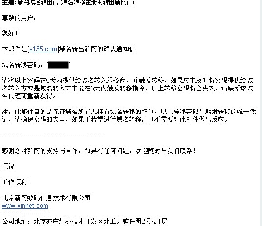 由于“新网”在上海有分支机构,所以代理商加盖代理公章转寄给“新网”属于同城快递,当天寄第二天就能收到。1月21日,E-mail 收到“新网”的域名转移密码:
