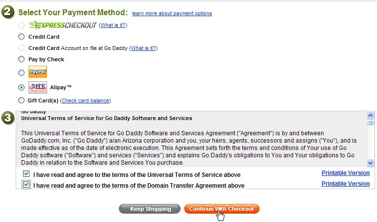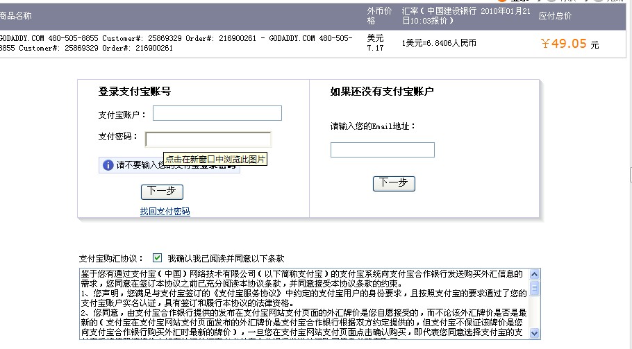 6、选择使用“支付宝”付款。使用“支付宝”付款要比VISA信用卡要安全得多。VISA信用卡在国外消费只需要信用卡卡号、信用卡正面的英文姓名和背后的3个数字即可,无需实卡,每次交易不需要输入密码。一旦输入你的信用卡信息,商家将来可以无需征求你的同意自行扣款(例如当你选择自动续费时,域名到期商家就会自动从你的信用卡扣款续费。),如果信用卡信息被盗,后果更是不堪设想。