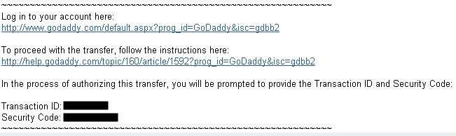 9、付款成功后,邮箱收到一封来自transfers@godaddy.com、标题为“Transfer of S135.COM”的邮件。记住邮件里的“Transaction ID”和“Security Code”,接下来会用到。