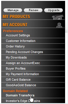 10、点击Godaddy右上角的 “My Account”进入会员中心,选择左边菜单栏中的“Domain Transfers”。