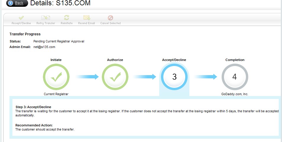 17、查看域名转移状态。如果前域名注册商(新网)不人工确认此次转移(以新网通常的做法,是不会去确认的),5天后,域名将自动转移到Godaddy。