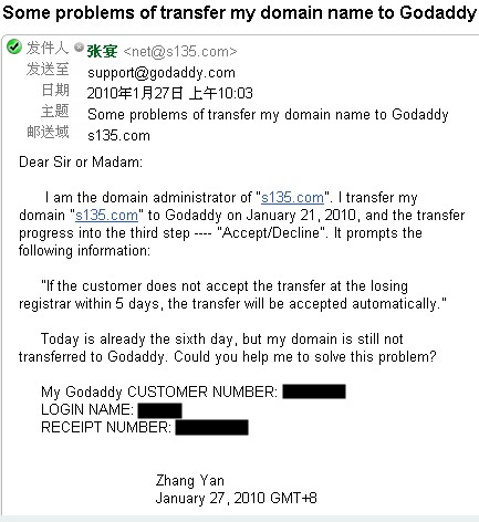 从2010年1月16日向新网代理商索要域名转移密码,到2010年1月27日13:55分Whois信息中的域名注册商变更为Godaddy,历时11天,我的域名 s135.com 成功转移到国外。