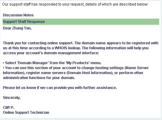 19、邮件发出四个小时后(2010年27日13:55分),通过 http://www.internic.net/whois.html 查询域名Whois信息,注册商已经成功变更为 Godaddy,并收到 Godaddy 客户支持技术员的回信,以及一封标题为“Domain Transfer Confirmation”的域名转移接受成功的邮件。
