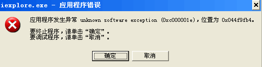 问题症状是:每当打开IE浏览器上网,时隔一段时间,会弹出“应用程序发生异常 unknown software exception (0xc000001e),位置为0x044f9fb4”的错误对话框,如下图!