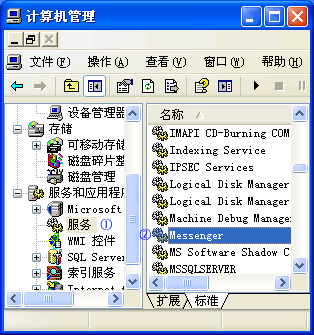 上图中,找到“服务和应用程序”下面的“服务”,如上图①所示,接下来,在右方找到“Messenger”项并双击,如上图②所示。