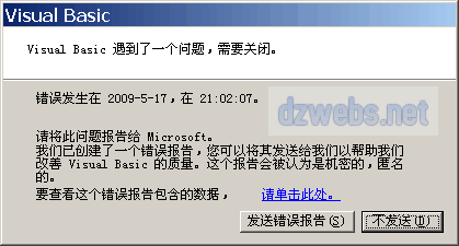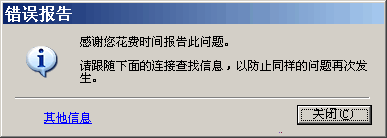 大体内容就是“XXX遇到了一个问题,需要关闭”,接着,对话框中有两个按钮,分别为“发送错误报告”和“不发送”,如下图,是其中的一个错误例子。