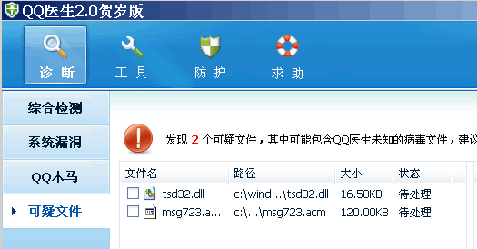 使用QQ医生,对可疑文件进行扫描,如果找到可疑文件,就将它们统统清理掉,如下图!