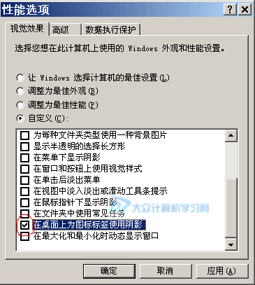 上图中,切换到“视觉效果”选项卡,之后选择“自定义”,最后在列表里面找到如上图的“在桌面上为图标标签使用阴影”,在其前面打上一个√;