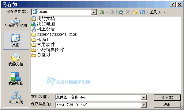 关于“另存为”对话框;如果一个文件是新建的,当前还在使用应用软件对其进行修改,那么,该文件还未被保存到外部存储器中,而是存在于内存储器的随机存储器中,这个时候,无论选择“保存”还是“另存为”,都会弹出“另存为”对话框。请大家注意区别,深入理解。