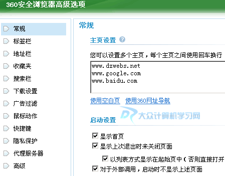 1、在常规选项,我们可以设置浏览器的主页,该浏览器与其它浏览器不同,它允许设置多个主页,而其它浏览器多数只能设置一个主页。设置方法如下,请自行看图,就不做介绍了。