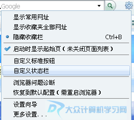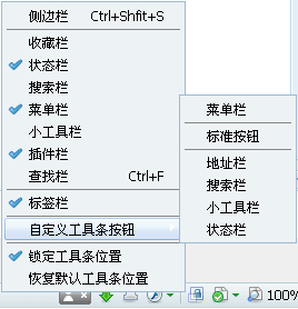 鼠标左键移到该浏览器的状态栏,即浏览器最下面的那个位置,点击右键,就会弹出菜单,如下图!