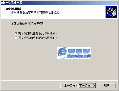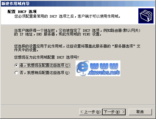 上图中,指的是通过DHCP分配的IP地址的有效时间,默认是8天,您也可以自行修改,然后点击“下一步”。弹出如下图对话框!