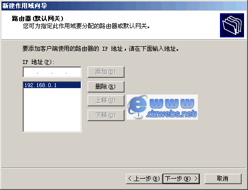 上图中的IP地址,非常重要,需要输入客户端所在局域网的路由IP地址,一般,指的就是每台计算机所使用的默认网关了,请根据需要自行输入然后点击“添加”,然后点击“下一步”。