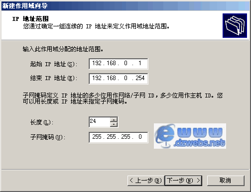 上图中,需要输入局域网中的IP地址范围的起始IP地址和结束IP地址,最后再输入您的局域网所使用的子网掩码,至于“长度”那一项,不需要修改,是自动生成的。然后点击“下一步”,弹出如下图的对话框!