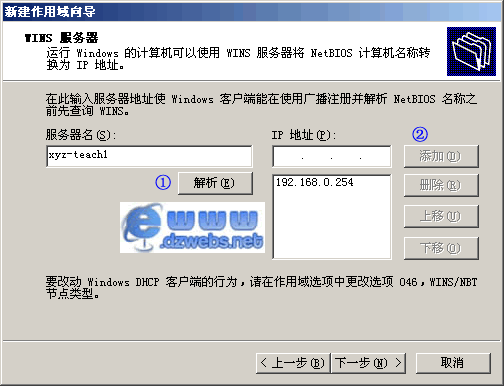 注意哦,这里的ip地址不是自己输入的,是根据安装DHCP的计算机名称解析得到的,如果弄错了,将会功亏一篑。