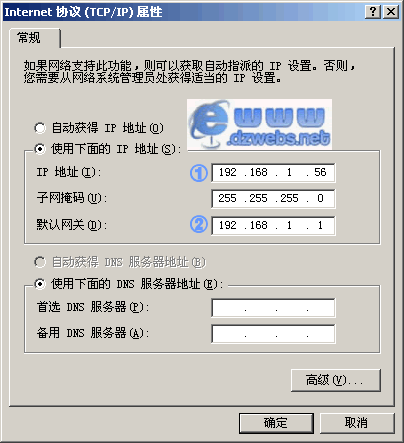 默认网关那里,请填写电信网通的路由地址,一般为192.168.1.1,要不就为:192.168.0.1;或者为:192.168.1.2……等等,这个地址,一般网通电信都会修改的,我们只有使用猜的办法了。