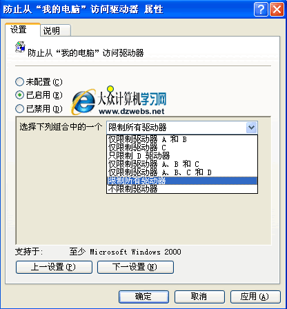 如上图一样,我们会在右边找到一下“防止从“我的电脑”访问驱动器”,双击它,弹出如下图对话框!