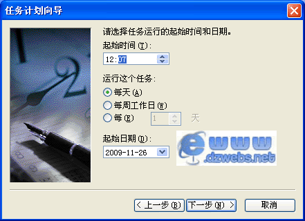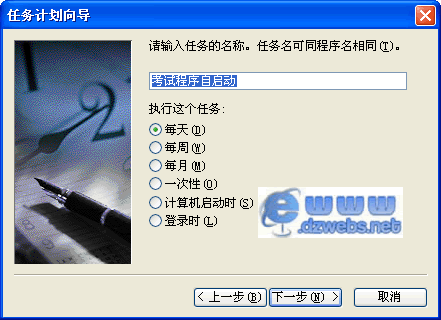 上图中,任务的名称那里,直接就使用默认的吧,当然,您可以自己修改。之后,在“执行这个任务”那里,选择好时间,本例选择“每天”,即让这个程序每天都定时自动运行。然后点击“下一步”。弹出如下图的对话框!