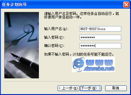 上图中,需要设置系统帐户的密码,在这里,输入的是开机帐户的密码,千万别错了,也别不填写啊,否则,自动运行程序的任务计划就失败洛。