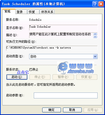 上图中,先在“服务和应用程序”列表中选中“服务”,之后在右边的列表中找到“Task Scheduler”左键双击,弹出如下图的对话框!