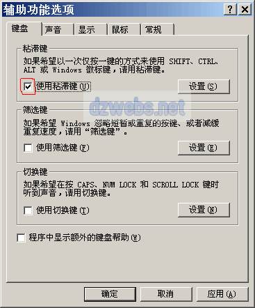 启动粘滞键可通过单击“开始→设置→控制面板→辅助功能选项”,在“键盘”选项卡下选中“使用粘滞键”来启动。如下图: