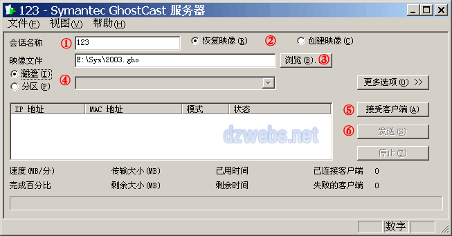 如果是“恢复映像”的话,那么,刚好反过来,先在服务器端点击“接收客户端”按钮,再按照③的操作设置好客户端。