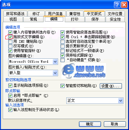上图中,我们将对话框切换到“编辑”选项卡,接下来,在“编辑”选项那里,找到“拖放式文字编辑”(在红线圈住那里),在其前面打上一个√勾,最后点击“确定”按钮确认并退出即可解决问题。