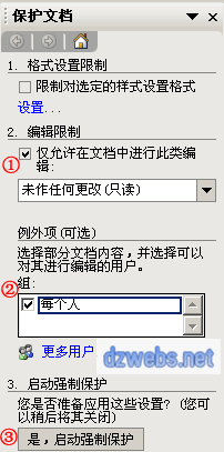第①步,在“仅允许在文档中进行此类编辑”前面打上一个√勾,然后,在其下面的下拉组合框中选择“未做任何更改(只读)”;
