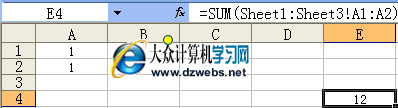 即,=SUM(Sheet1:Sheet3!A1:A2)
