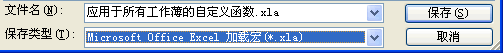 弹出另存为对话框,如下图,在对话框中,我们选择其保存类型为“Microsoft Office Excel 加载宏(*.xla)”,之后,输入文件名称,选择保存位置,最后点击“保存”按钮,将其保存。