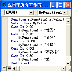 如下图,是我们已经建立好的一个自定义函数,其名称为MyFunction1,带有一个参数MyValue,函数的功能是判断成绩的等级。